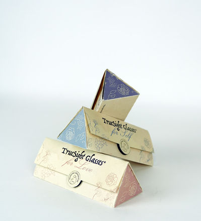 This highly conceptual product line, TrueSight Glasses, is based on Elizabeth Bennet from Pride and Prejudice. TrueSight Glasses help the wearer see things as they really are. The three models are TrueSight Glasses for Love, TrueSight Glasses for Judgement, and TrueSight Glasses for Self.